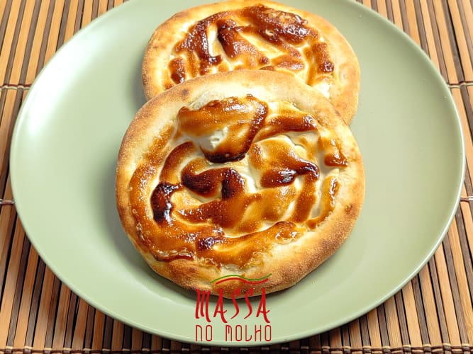 Deliciosa massa fofinha, fina camada de mussarela coberto com chocolate branco.