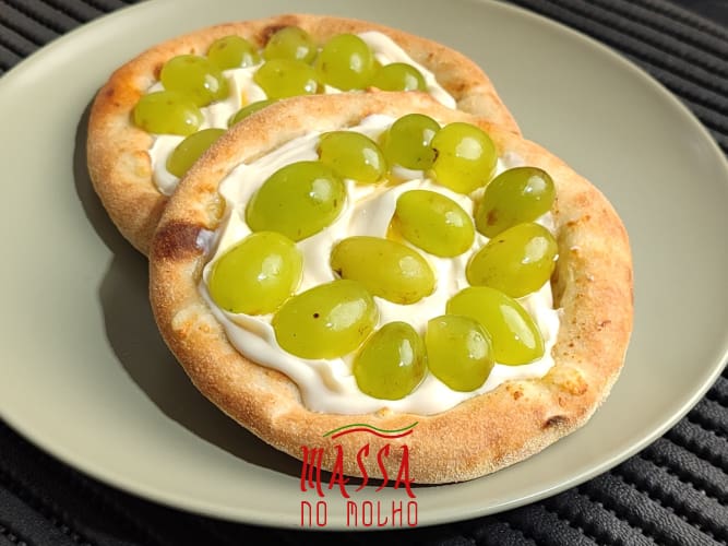 Deliciosa massa fofinha, fina camada de mussarela, chocolate branco e uvas verdes sem sementes.