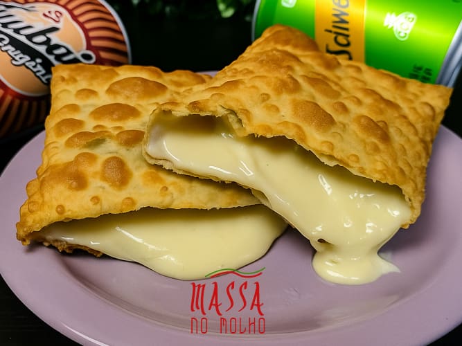 Deliciosa massa fofinha, fina camada de mussarela coberto com chocolate branco.